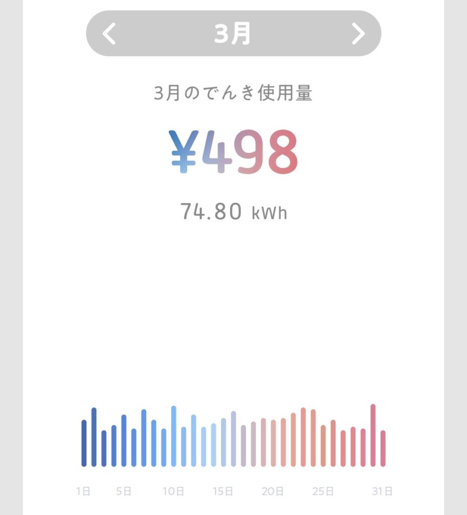 | 3月 | 74.80kWh | 498円 |